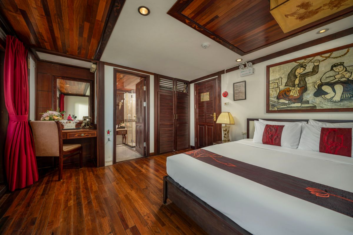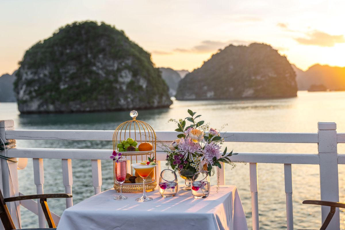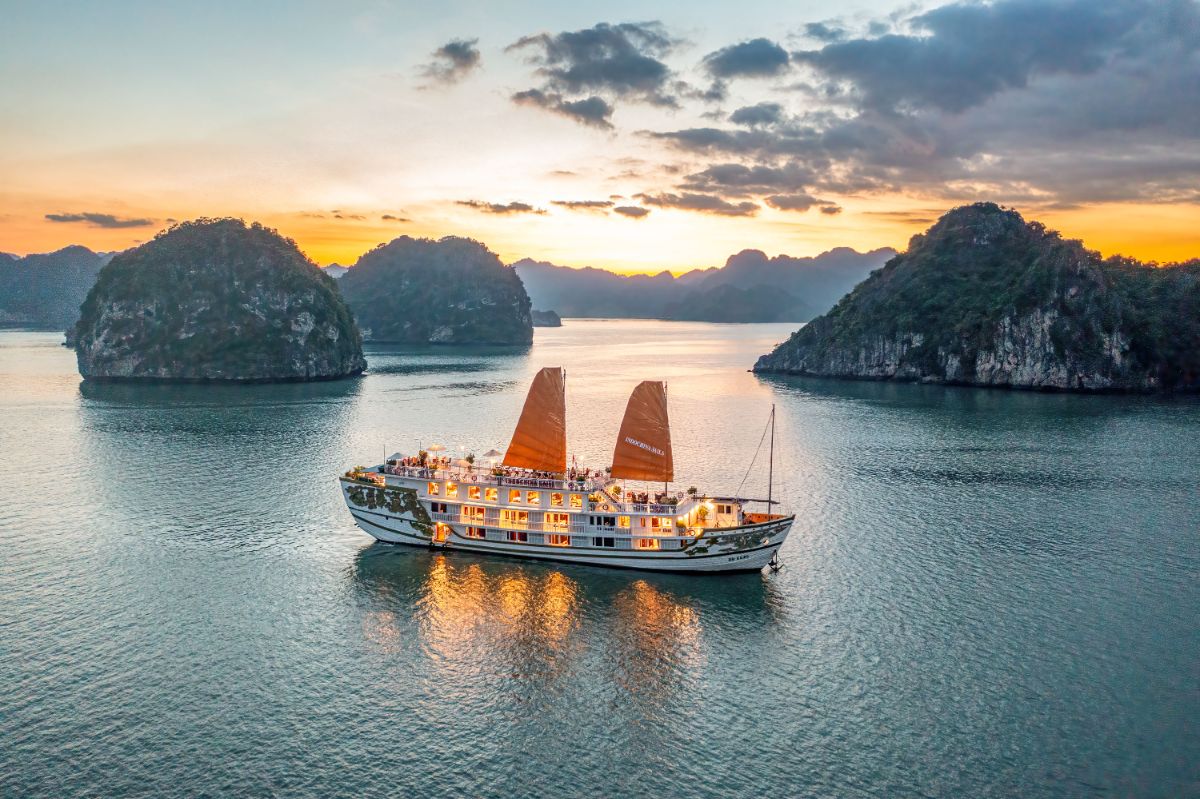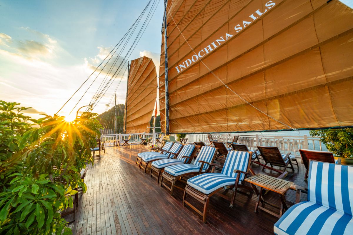 登上 Indochina Sails 游轮,享用迎宾饮品,并参加安全简报。