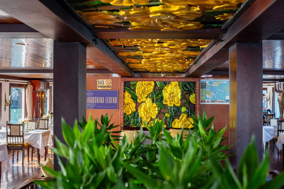 在餐厅享用美味自助午餐,航行间欣赏下龙湾迷人岛屿风光