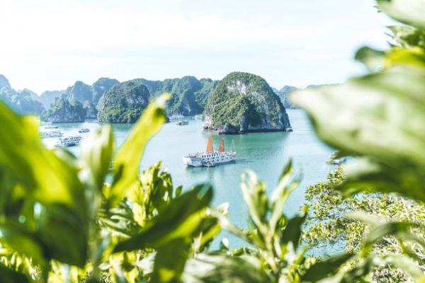 游览下龙湾,途经香炉岩(Incense Burner)与接吻岩(Kissing Rock)等著名地标。