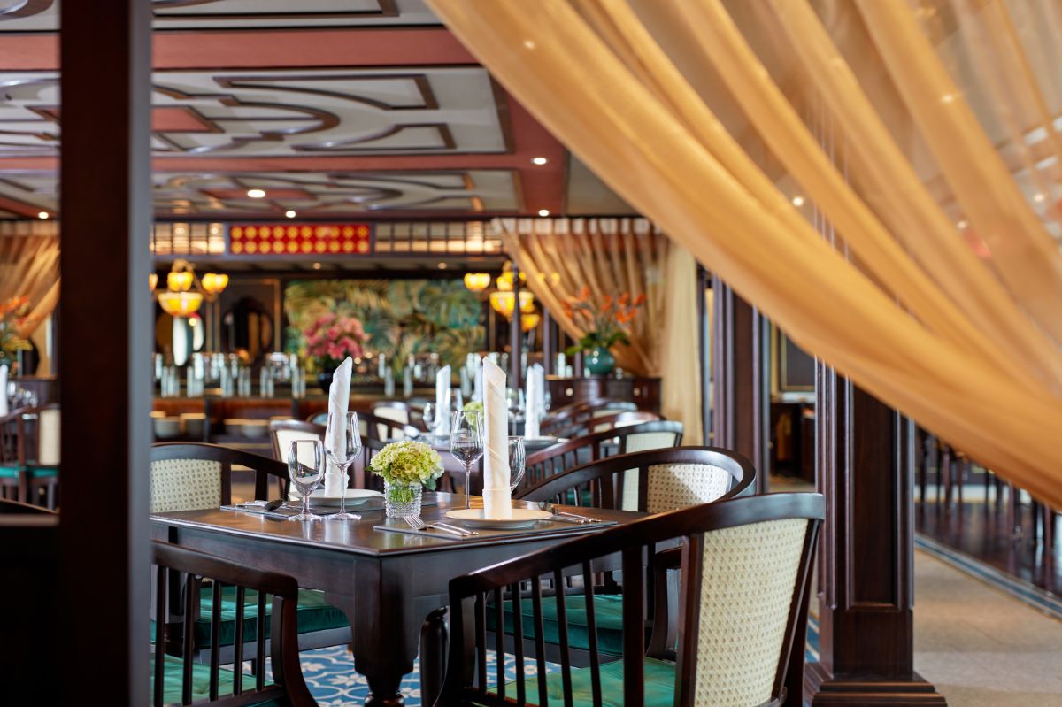 在餐厅享用美味自助午餐,航行途中欣赏下龙湾壮丽群岛风光。