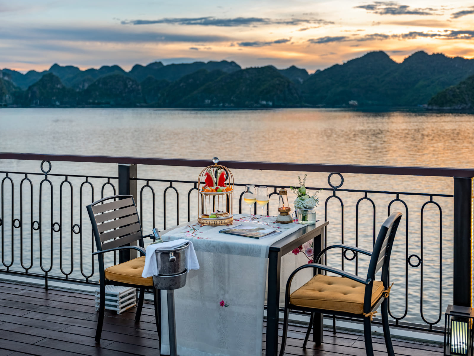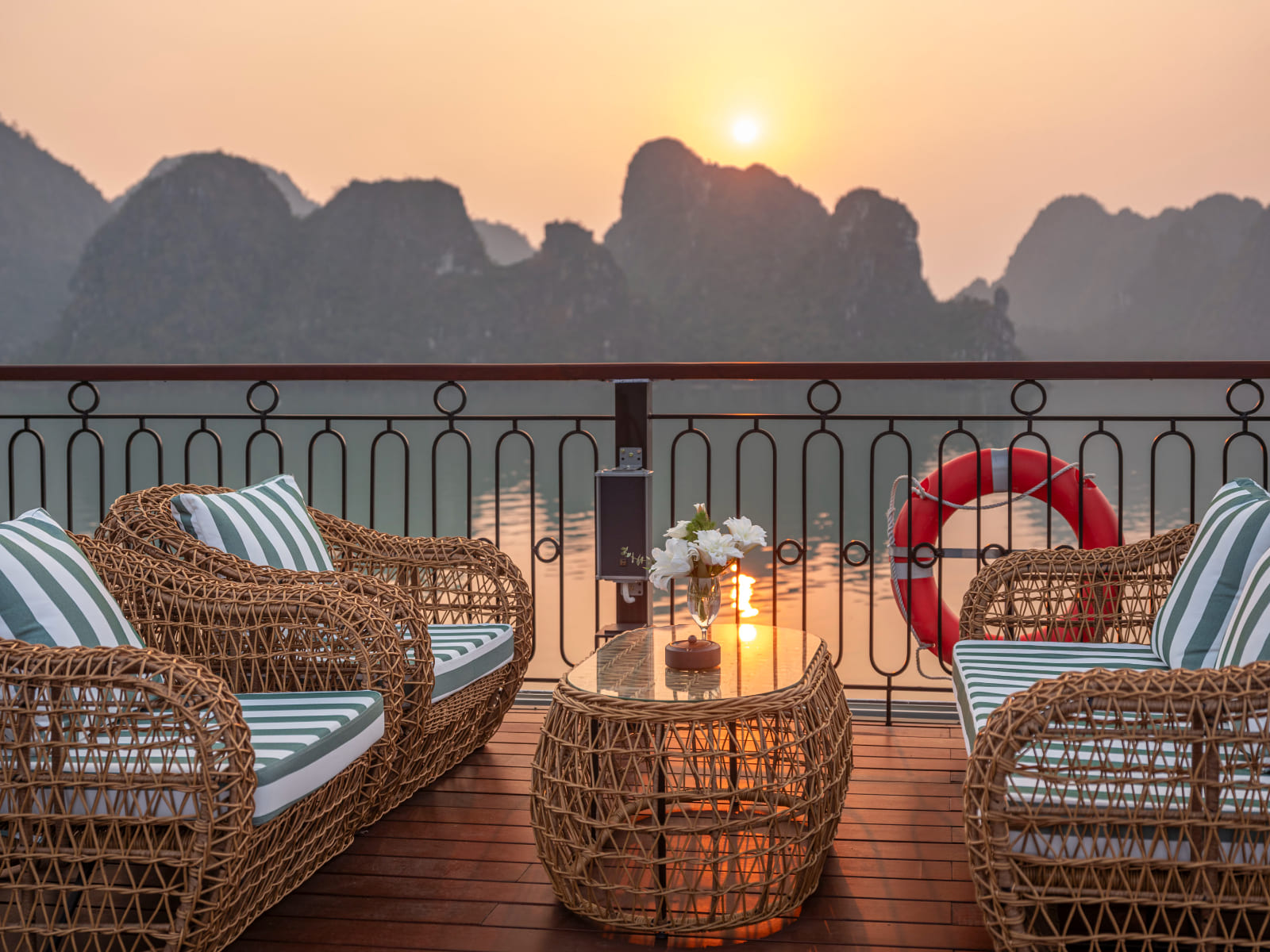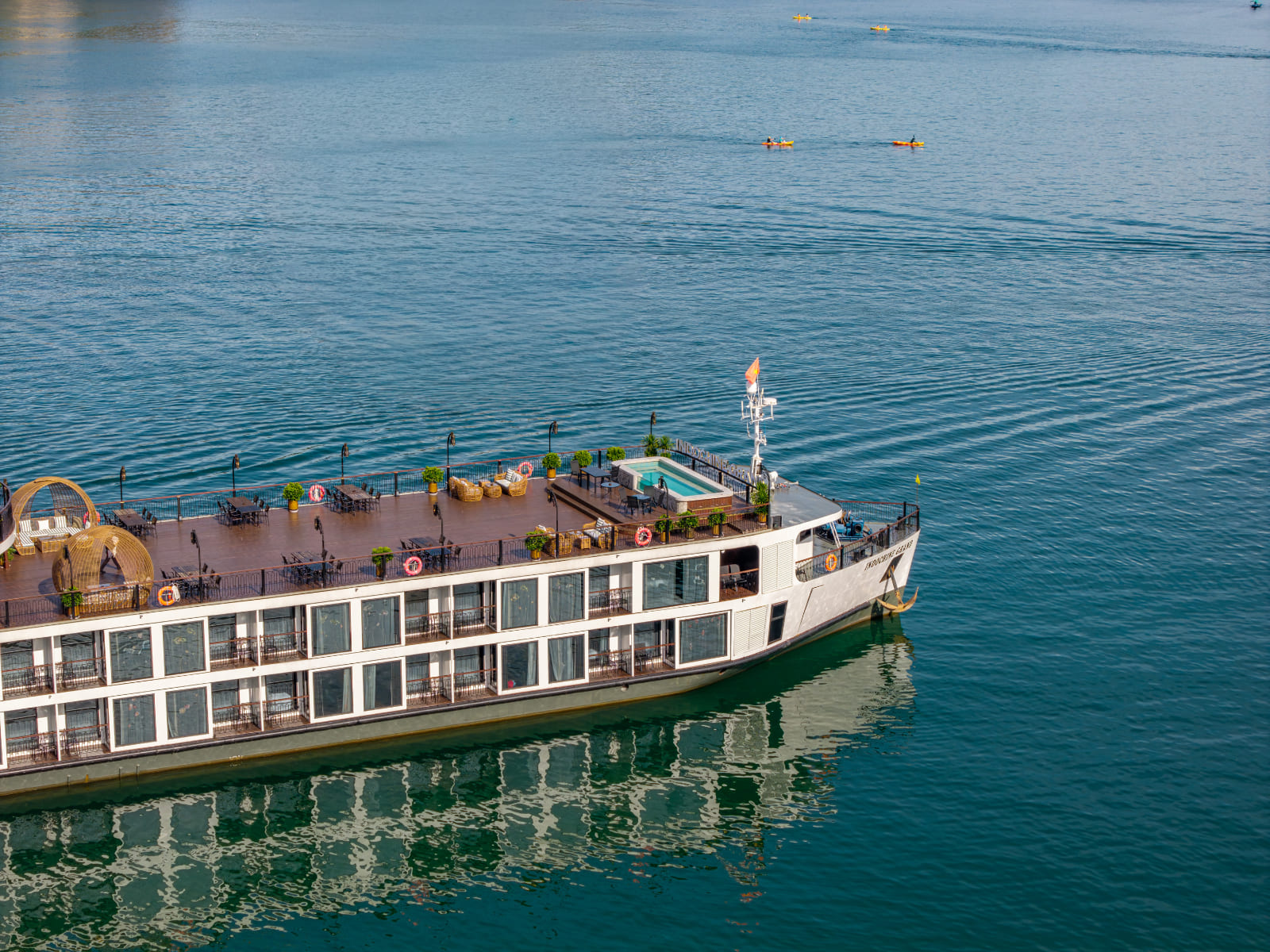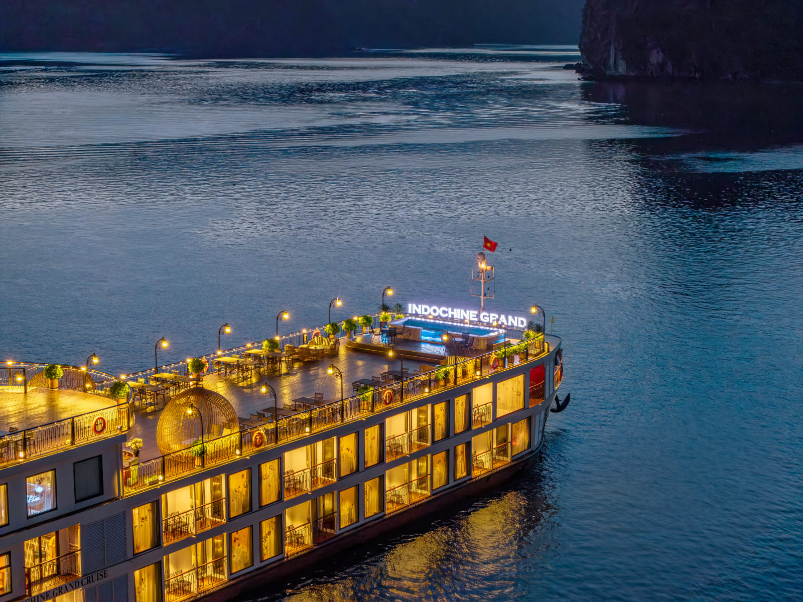 登船 & 行程说明 登上 Indochine Grand Cruise,享用欢迎饮品并参加安全说明会。